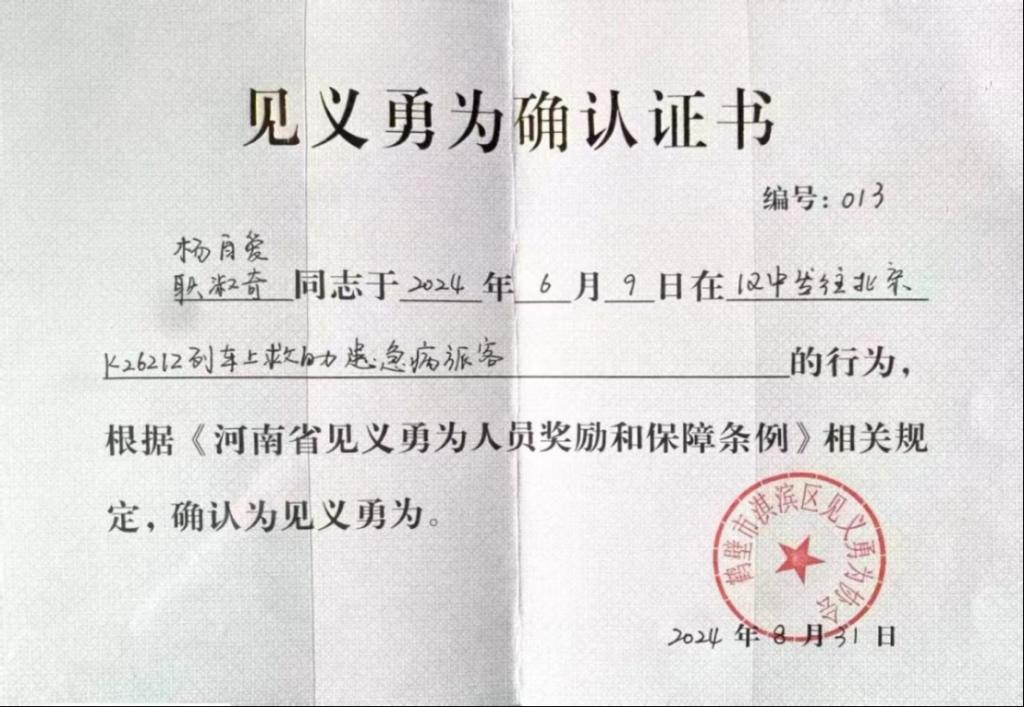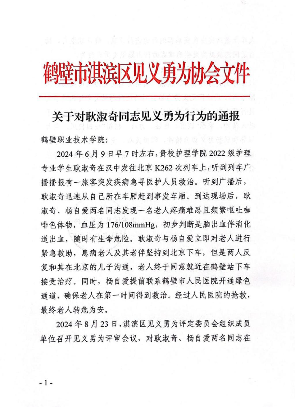 2024年6月9日,耿淑奇同学在汉中开往北京的K262次列车上,与人民医院杨自爱同志一起紧急救助一名突发脑出血伴消化道出血的老人,协助患病老人提前下车到鹤壁市人民医院进行紧急救治,经抢救最终老人转危为安。耿淑奇同学在火车上救人的先进事迹,充分展现了新时代老员工挺身而出、勇于担当、救死扶伤、无私奉献的高尚品格,诠释了“护佑生命、竭诚奉献、专业精湛、勇气非凡”的南丁格尔精神,传递青春正能量,践行了社会主义核心价值观。耿淑奇是bw必威西汉姆联官方网站员工的优秀代表,是全体师生学习的榜样。bw必威西汉姆联官方网站团总支倡议:全体青年员工向耿淑奇同学学习,苦练技能本领,增长知识才干,锤炼精神品格,勇担复兴重任,书写青春风采。